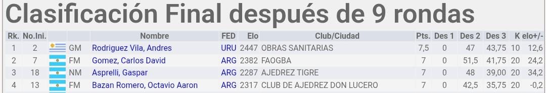Con apenas 14 años, Bazán cerró el certamen invicto, sumando 7 puntos en 9 partidas. Compartió el segundo puesto y terminó en la cuarta posición por sistema de desempate, superando a jugadores con mayor edad y experiencia.