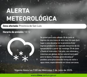 A partir de este sábado 28 de junio, se espera el ingreso de una masa de aire muy frío que dará lugar a una ola polar. El fenómeno producirá un marcado descenso de las temperaturas desde el domingo 29 de junio hasta el miércoles 2 de julio, con mínimas y máximas por debajo de los valores normales para esta época del año.