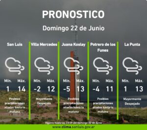 La Red de Estaciones Meteorológicas emitió una alerta por vientos muy fuertes que afectará a buena parte del territorio sanluiseño durante la mañana del domingo 22 de junio.