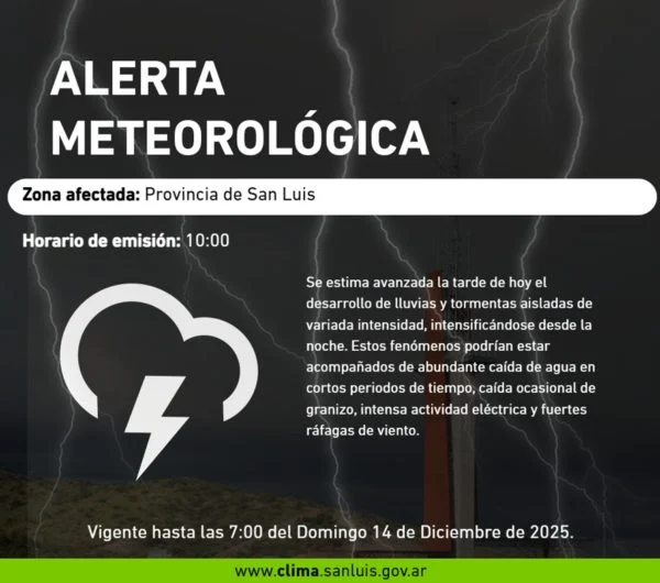 La Red de Estaciones Meteorológicas (REM) emitió este sábado 13 de diciembre por la mañana una alerta por tormentas de variada intensidad para toda la provincia de San Luis.