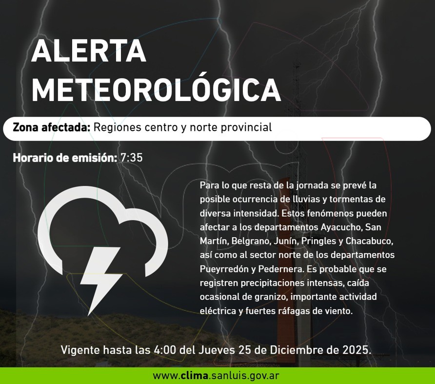 Las zonas alcanzadas por el alerta son los departamentos Ayacucho, San Martín, Belgrano, Junín, Pringles y Chacabuco, además del sector norte de Pueyrredón y Pedernera.