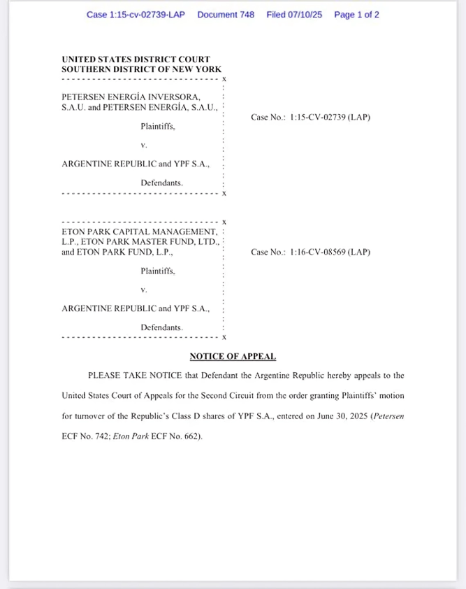 Argentina apeló la orden judicial que exige entregar las acciones de YPF para hacer frente a la sentencia de US$ 16.000 millones por la nacionalización de la petrolera.