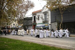 Luego de la misa, los fieles participaron de la procesión por las calles cercanas al templo, reafirmando la creencia central de esta solemnidad: la presencia real de Jesús en el pan y el vino consagrados.