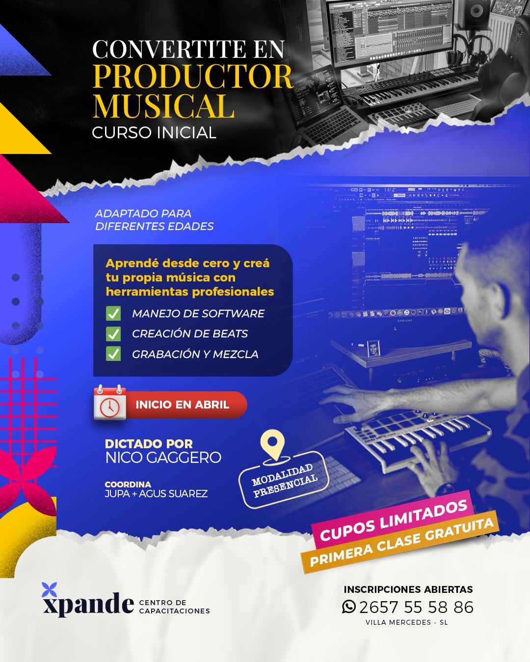 La ciudad de Villa Mercedes, San Luis, suma una nueva propuesta educativa en el ámbito artístico con el lanzamiento del Curso de Producción Musical, diseñado para quienes buscan iniciarse o perfeccionarse en la creación de música electrónica, beats y mezclas. La iniciativa, organizada por @xpande.capacitaciones, combina enseñanza teórica y práctica bajo la dirección del productor Nico Gaggero y la coordinación de los reconocidos DJs locales Jupa y Agus Suárez.