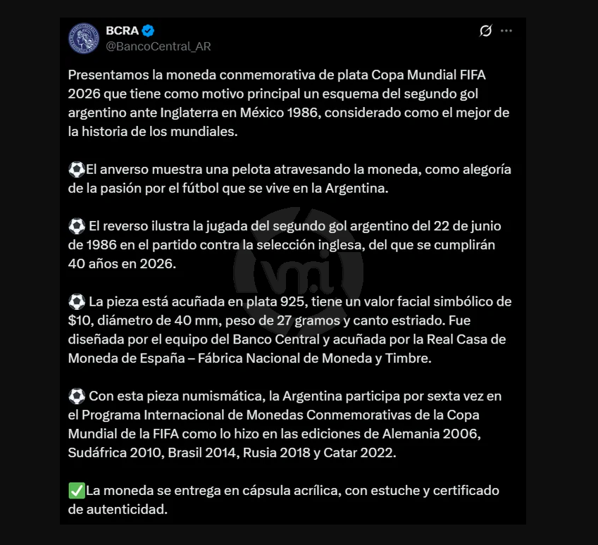 El Banco Central de la República Argentina (BCRA) presentó una moneda conmemorativa del Mundial FIFA 2026, inspirada en el legendario segundo gol de Argentina a Inglaterra durante el Mundial de México 1986. Sin embargo, la polémica estalló rápidamente: en ningún momento se mencionó al autor del tanto, Diego Armando Maradona, generando una ola de críticas en redes sociales.