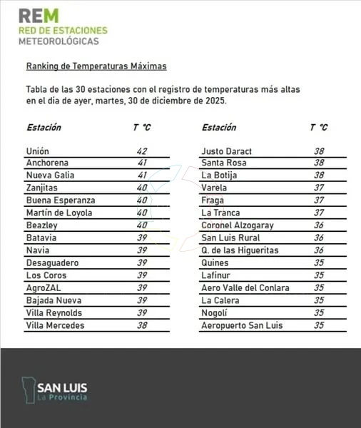 Según el ranking de temperaturas máximas elaborado por la Red de Estaciones Meteorológicas (REM), Unión encabezó la lista con 42°C, registrados durante la jornada del martes 30.