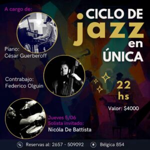 Cada primer jueves del mes, Única se convierte en escenario de un ciclo de jazz creativo impulsado por el contrabajista Federico Olguín y el pianista César Gerberoff. La propuesta, que ya va por su tercera edición, apuesta a la rotación de solistas invitados y a la espontaneidad como sello distintivo.