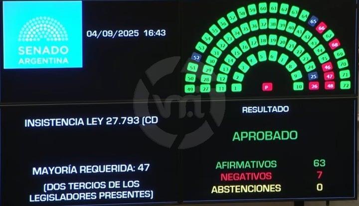 Con 63 votos afirmativos y 7 negativos, la Cámara Alta acompañó lo decidido previamente por Diputados. La oposición —integrada por el interbloque peronista, UCR, PRO y bloques provinciales— se impuso de manera contundente, mientras que el oficialismo solo sumó el respaldo de la senadora del PRO Carmen Álvarez Rivero y del legislador Francisco Paoltroni, alineado con la Casa Rosada.