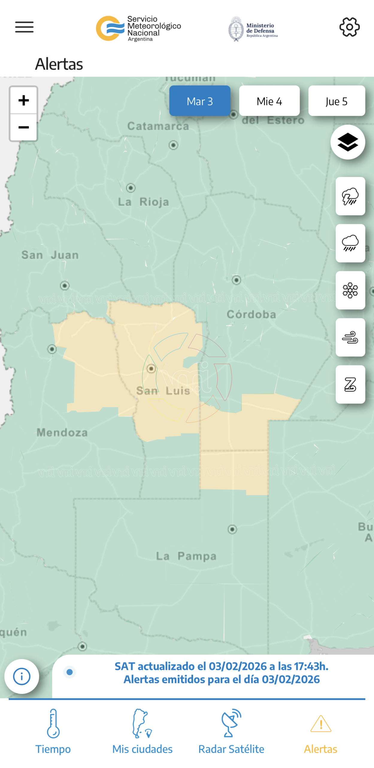 El Servicio Meteorológico Nacional emitió una alerta amarilla por tormentas para Villa Mercedes, ante la probabilidad de fenómenos meteorológicos de variada intensidad durante la noche de este martes y la madrugada y mañana del miércoles.