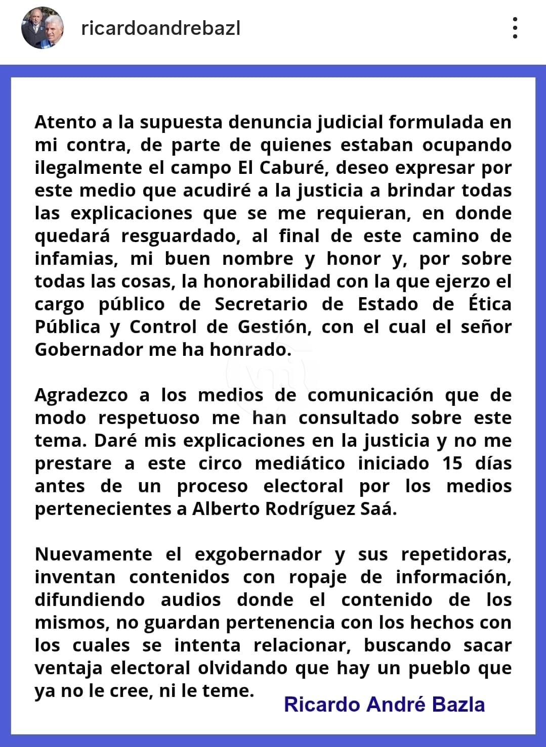 “Atento a la supuesta denuncia judicial formulada en mi contra, de parte de quienes estaban ocupando ilegalmente el campo El Caburé, deseo expresar por este medio que acudiré a la Justicia a brindar todas las explicaciones que se me requieran, en donde quedará resguardado, al final de este camino de infamias, mi buen nombre y honor y, por sobre todas las cosas, la honorabilidad con la que ejerzo el cargo público de Secretario de Estado de Ética Pública y Control de Gestión, con el cual el señor Gobernador me ha honrado.”