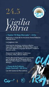 Este sábado a las 23 hs, el Teatro “El Viejo Mercado” será sede de la Vigilia Patria en conmemoración del 25 de Mayo. El evento contará con la participación de destacados artistas locales, incluyendo a Juglares Folk, los ballets folklóricos La Patria, IFAL y Rincón Nativo, y el grupo de teatro Federico García Lorca. La ambientación estará a cargo de Dj Jupa y Vj Adrián Rojo, con intervenciones de luces y efectos especiales.