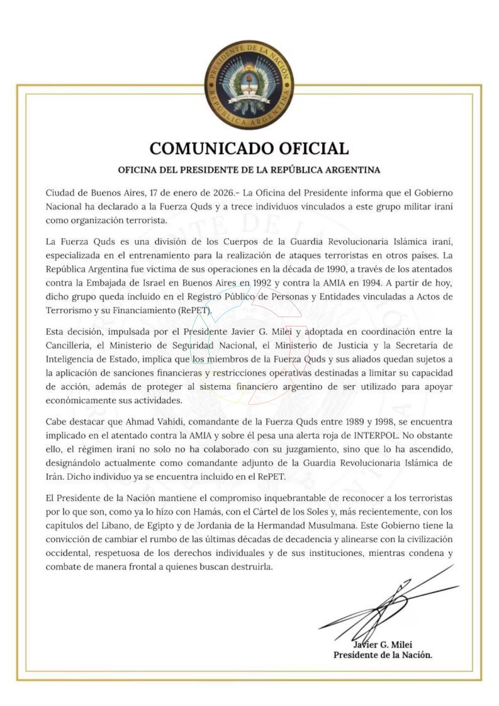La declaración oficial de la Casa Rosada fue difundida el sábado y señala que el Gobierno Nacional incorporó a la Fuerza Quds y a trece personas vinculadas a esa estructura militar al Registro Público de Personas y Entidades vinculadas a Actos de Terrorismo y su Financiamiento (RePET). La resolución contempla sanciones financieras y restricciones operativas, con el objetivo de limitar su capacidad de acción y resguardar el sistema financiero argentino.