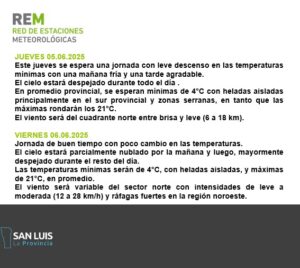 Durante la mañana, el ambiente se presentará frío, con una temperatura mínima promedio de 4°C en la provincia, además de la posibilidad de heladas aisladas en algunas zonas. A medida que avance el día, se prevé que la máxima alcance los 21°C, con condiciones estables y agradables.