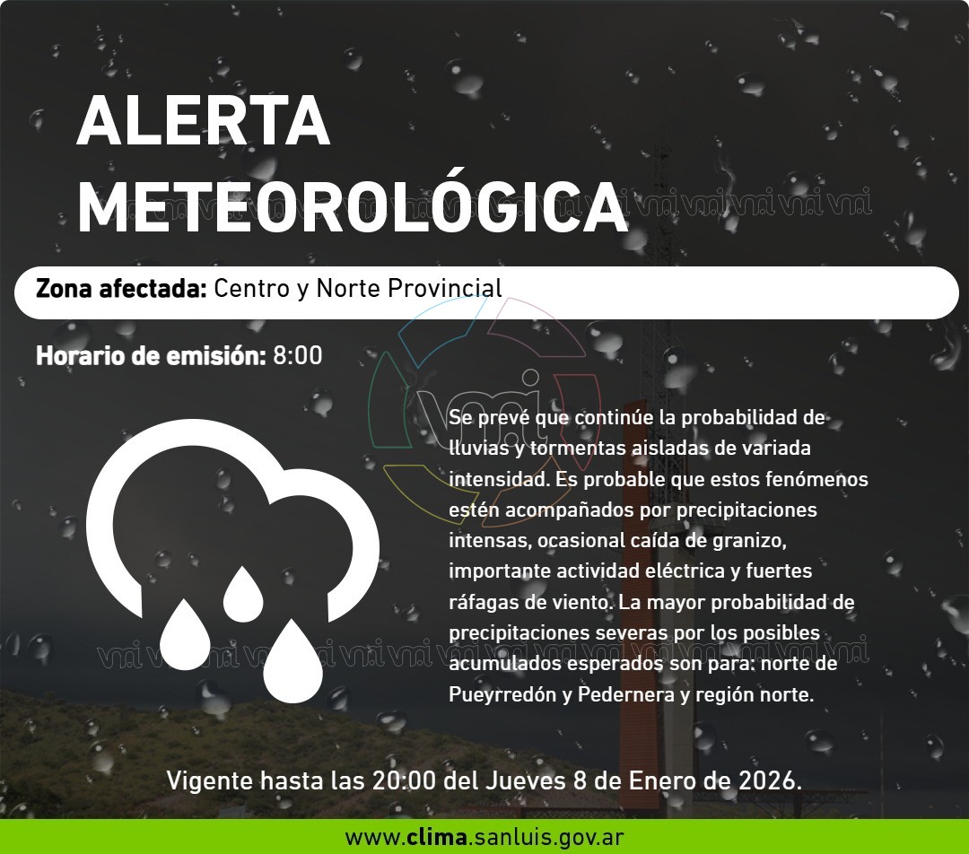 Se prevé la continuidad de lluvias y tormentas aisladas de variada intensidad, que podrían estar acompañadas por precipitaciones intensas, ocasional caída de granizo, fuerte actividad eléctrica y ráfagas de viento intensas.