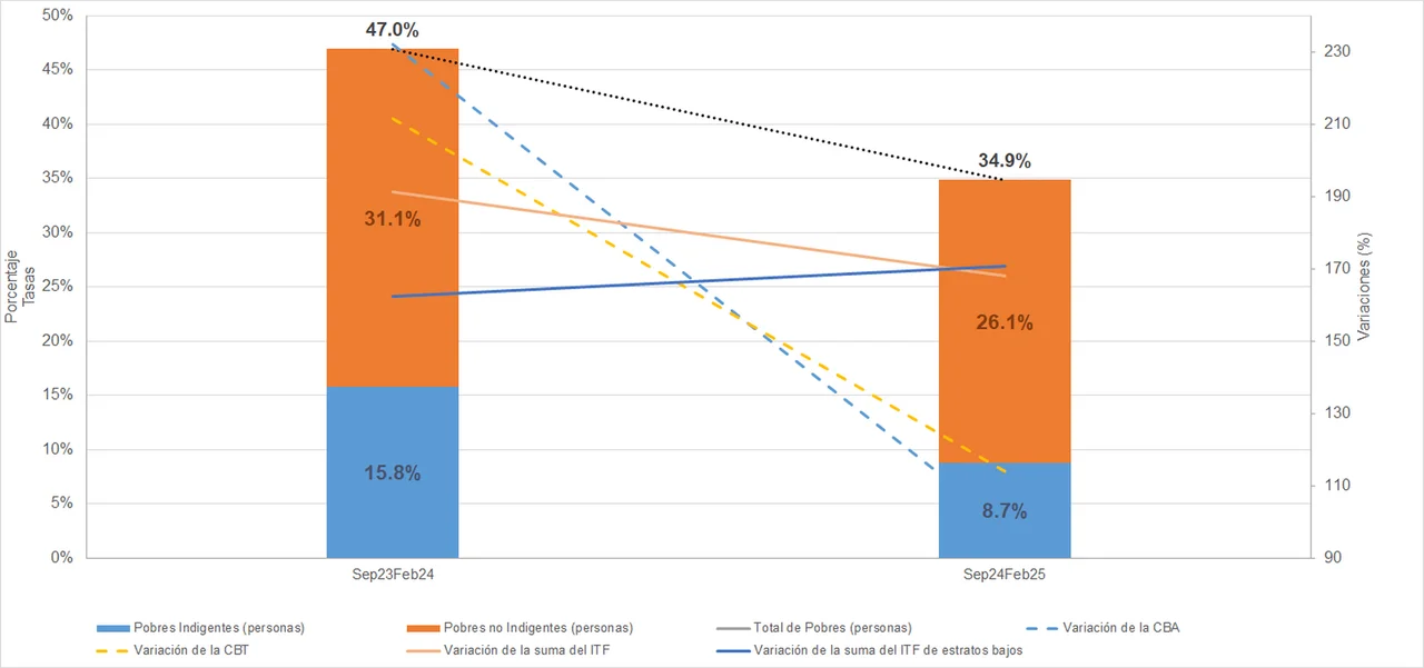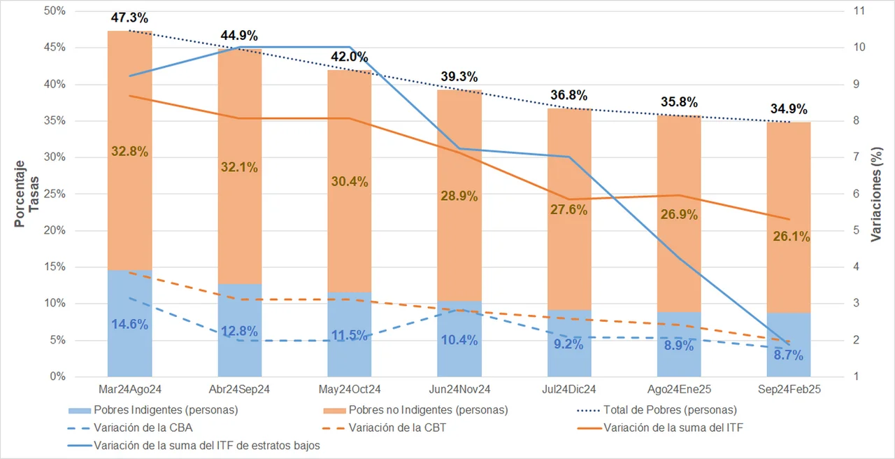 El informe, liderado por el especialista Martín González-Rozada, director de la maestría de Econometría de la Di Tella, estimó que la pobreza cayó 12 puntos porcentuales en el semestre comprendido entre septiembre de 2024 y febrero de 2025, pasando de un 47% a un 34,9%. Además, la tasa de indigencia también registró una disminución significativa, cayendo de 15,8% a 8,7% en comparación con el mismo período del año anterior.