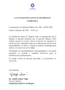 La Fundación Santa Fe de Bogotá difundió este domingo el último parte médico sobre el estado de salud del candidato presidencial colombiano Miguel Uribe Turbay, quien fue baleado en la cabeza durante un evento político el sábado por la tarde.