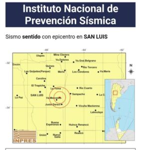La Subsecretaría de Defensa Civil difundió un reporte emitido por el Instituto Nacional de Prevención Sísmica (INPRES) sobre un movimiento telúrico registrado en la provincia de San Luis.