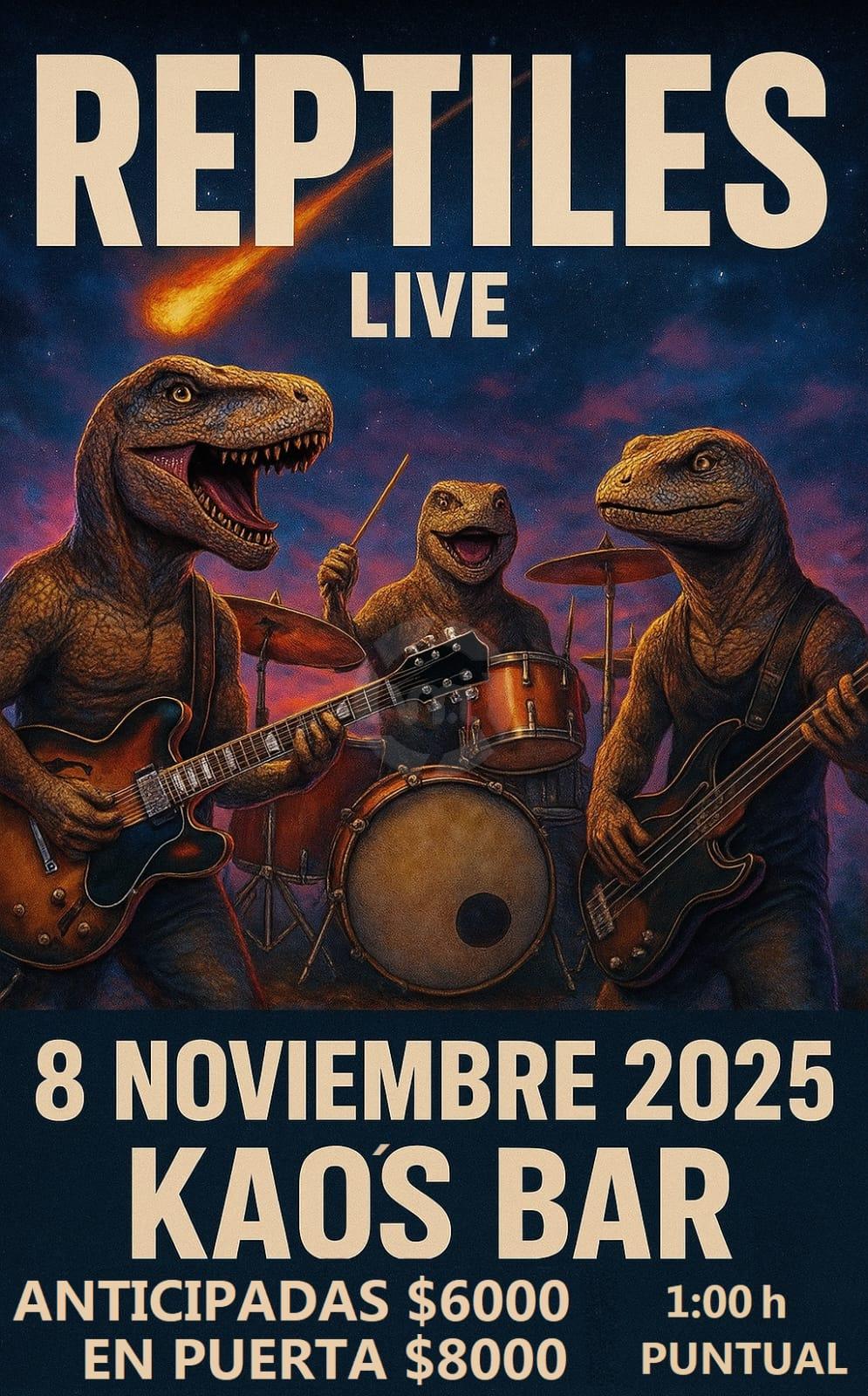 Tras meses de trabajo y composición, Reptiles tendrá su primera presentación oficial este viernes 8 de noviembre en Kao´s Bar, donde desplegarán trece canciones, entre temas propios e instrumentales, además de un cover sorpresa para el cierre.