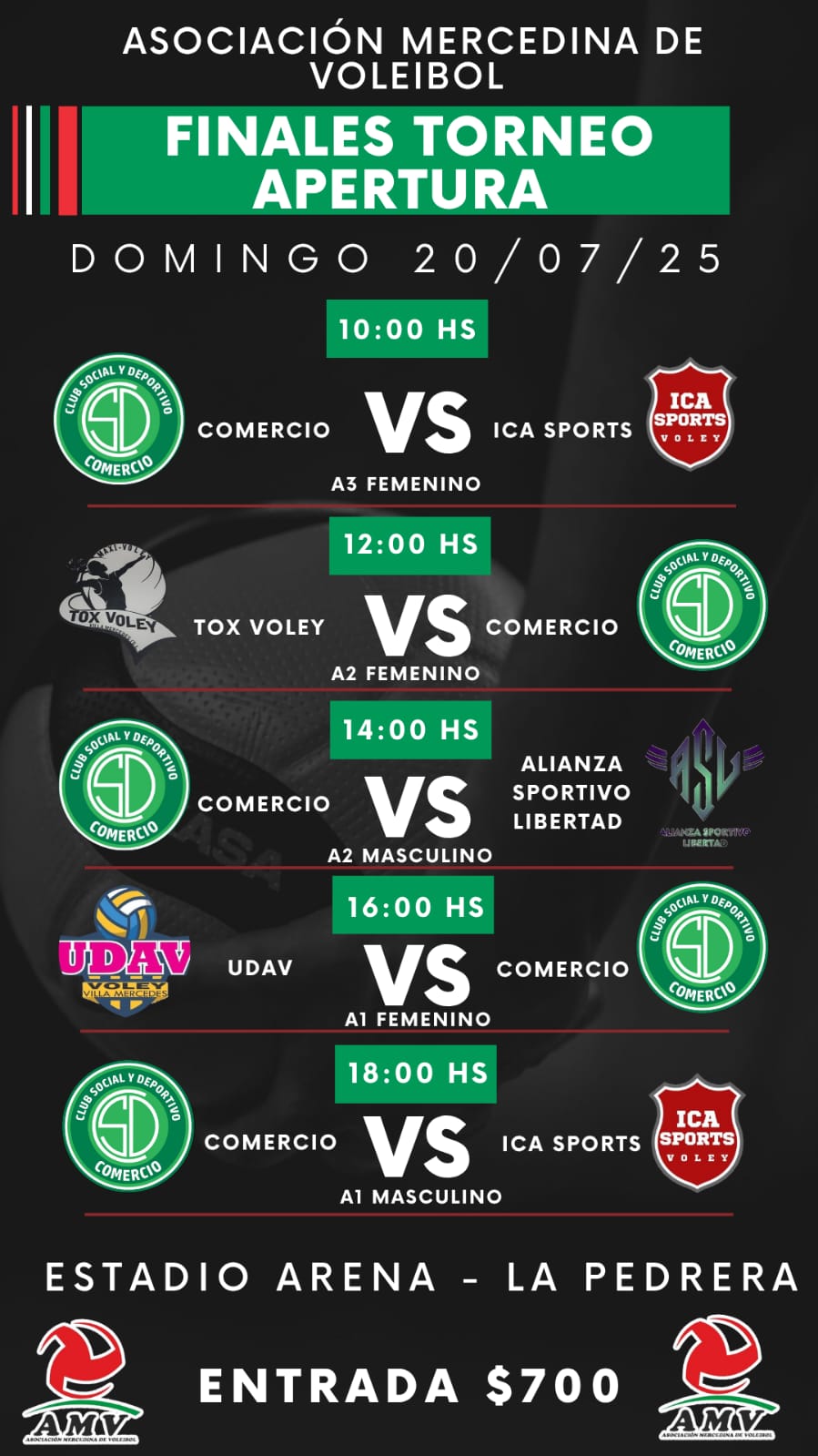 La Asociación Mercedina de Voleibol vivirá un domingo histórico con las Finales del Torneo Apertura, que se disputarán el próximo 20 de julio en el Estadio Arena – La Pedrera.