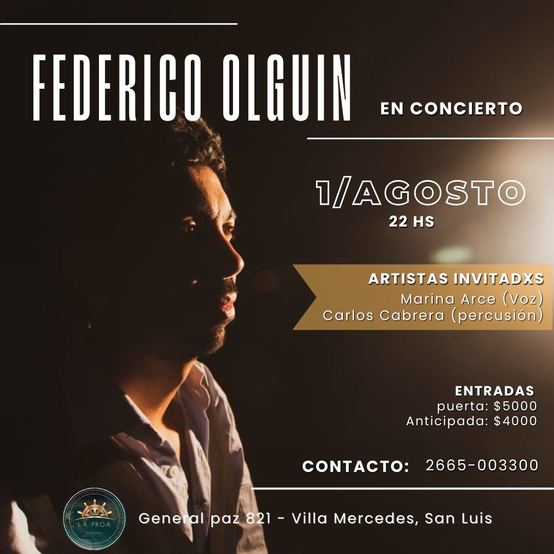 El reconocido músico Federico Olguín se presentará el 1° de agosto en Villa Mercedes, en un concierto que promete ser una experiencia sonora única. Acompañado por dos artistas invitados de gran trayectoria —Marina Arce y Carlos Cabrera—, el espectáculo se desarrollará en el cálido ambiente de La Proa Taberna, un espacio que ya es sinónimo de buena música y atención dedicada.