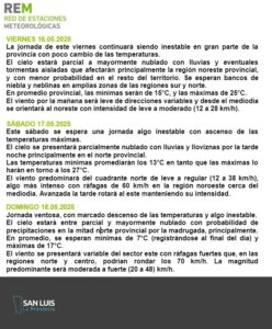 El meteorólogo destacó que las temperaturas varían entre localidades: Villa Reynolds y La Grosal pueden registrar diferencias de hasta 3°C respecto a Villa Mercedes. El meteorólogo aclaró que estas estaciones se instalaron en colaboración con la Fuerza Aérea y la escuela agrotécnica.