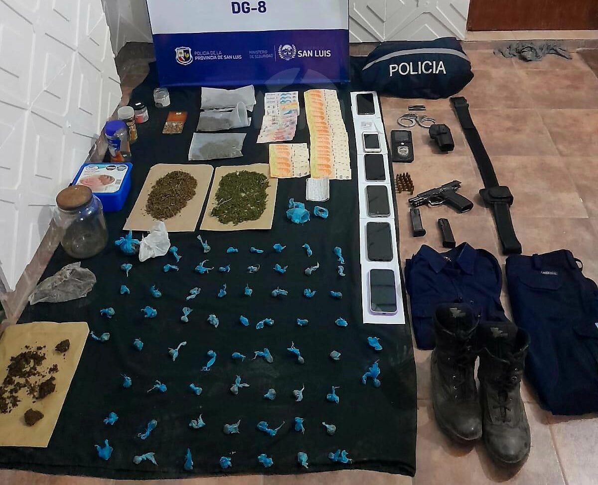 En el allanamiento, realizado en el domicilio del agente, se secuestraron 385,1 gramos de marihuana, teléfonos celulares, dinero en efectivo, semillas de cannabis, un arma de fuego con cargadores y municiones, además de indumentaria y documentación policial perteneciente al detenido. También se incautaron un automóvil y una licencia de conducir.