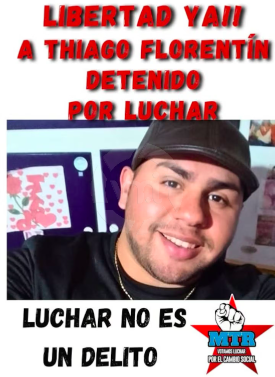 Uno de los demorados fue liberado rápidamente, mientras que el otro, identificado como Thiago Florentín (22 años), continúa alojado en la Comisaría 1° de Lomas de Zamora. Según informaron, el joven es militante del Movimiento Teresa Rodríguez (MTR) Votamos Luchar y tiene domicilio en Alejandro Korn.