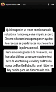 Horas después, Navarro publicó un fuerte mensaje en Instagram, insinuando las palabras de Bobadilla y afirmando: “Nunca me avergonzaré de mis raíces. Iré hasta las últimas consecuencias”.