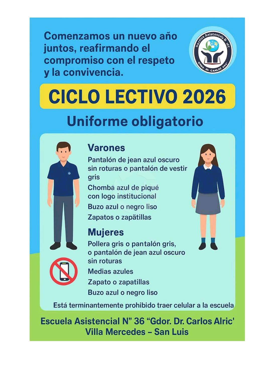 La Escuela Asistencial N°36 “Gobernador Dr. Carlos Alric” de Villa Mercedes emitió un comunicado en el que adelantó medidas para el ciclo lectivo 2026. Entre los puntos más relevantes, la institución informó que el uso del uniforme será obligatorio y que estará prohibido el ingreso con teléfonos celulares.