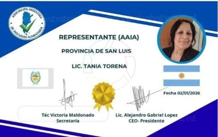 La Asociación Argentina de Inocuidad Alimentaria (AAIA) incorporó recientemente a Tania Torena, Licenciada en Seguridad Alimentaria y vecina de Villa Mercedes, a su red federal de profesionales especializados, fortaleciendo la presencia del interior del país en ámbitos técnicos vinculados a la calidad y seguridad de los alimentos.