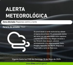 La Red de Emergencia Meteorológica (REM) emitió un nuevo alerta durante la tarde de este sábado por vientos intensos que afectarán a gran parte de la provincia de San Luis. Los departamentos involucrados son: Pueyrredón, norte de Pedernera, Junín, Pringles, Belgrano, San Martín y Ayacucho.