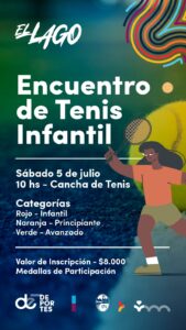 El próximo sábado 5 de julio, desde las 10:00 hs, se realizará un encuentro de tenis infantil en las instalaciones de El Lago, en Villa Mercedes. La actividad reunirá a jóvenes deportistas de la ciudad, de distintos puntos de la provincia de San Luis y de localidades vecinas.