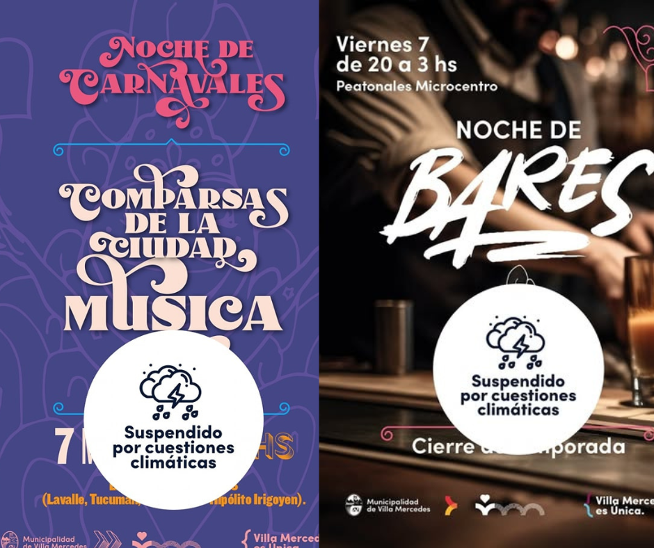 La Municipalidad de Villa Mercedes informa que debido a las condiciones meteorológicas de la jornada de hoy, por la Alerta Meteorológica a Nivel Naranja para la ciudad, y por razones de seguridad, se ha decidido dichas actividades hasta nuevo aviso.