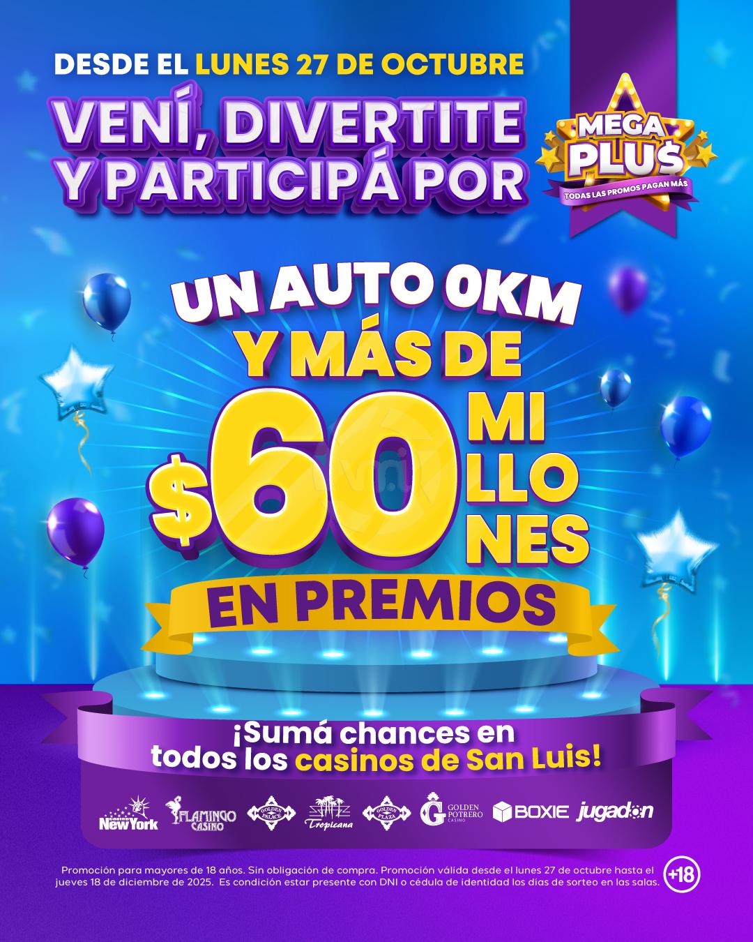 Para más información y novedades, se puede visitar www.megaplus.com.ar o seguir las redes oficiales: @casinogolden.palace, @tropicana.sanluis, @casinonewyork_, y @casinoflamingo_.
