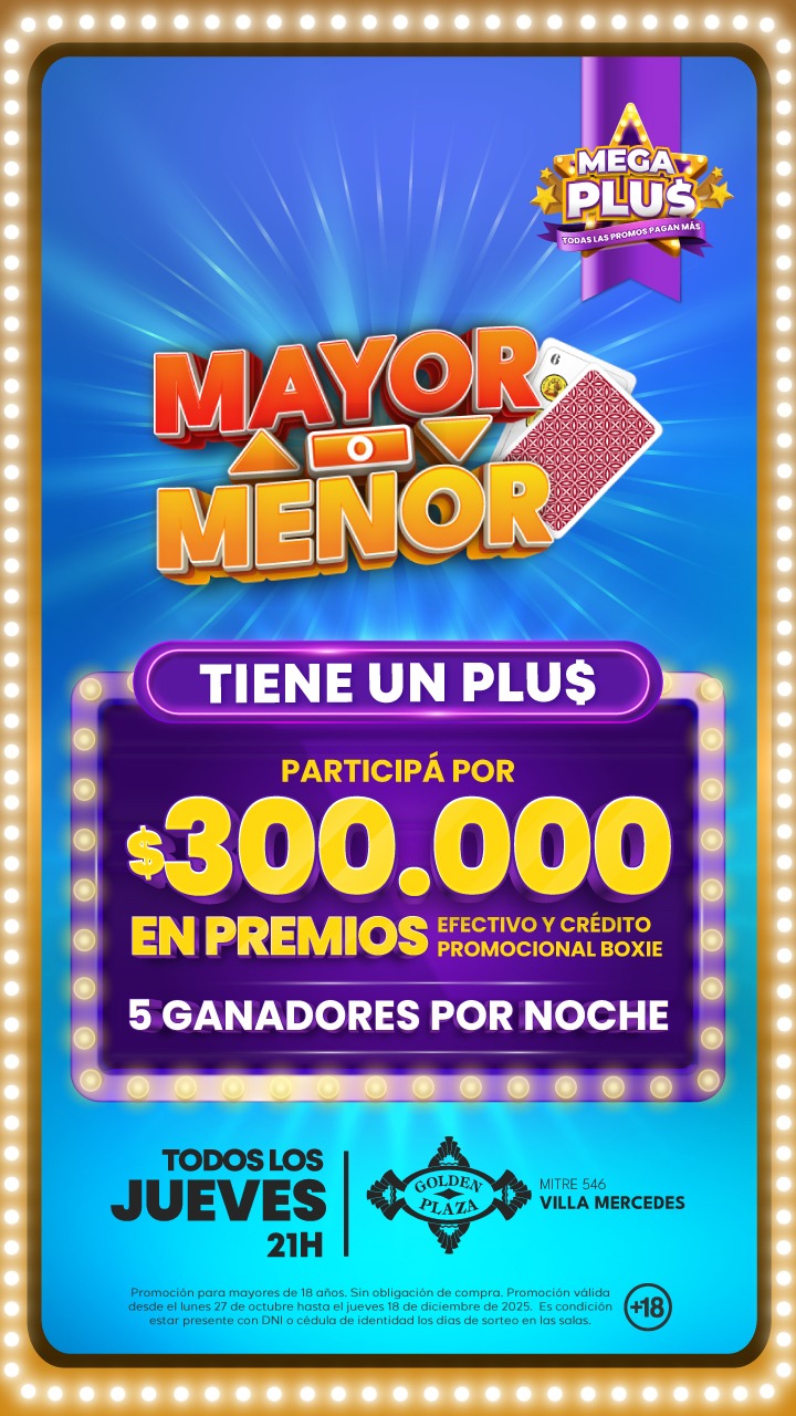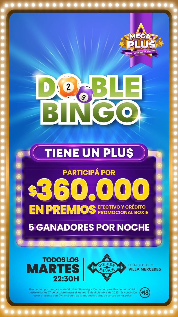 Para participar, es requisito ser mayor de 18 años y estar presente en la sala al momento del sorteo. La promoción se vive con entusiasmo en los casinos Golden Palace, Golden Plaza, Golden Potrero, Casino New York, Tropicana y Flamingo Casino, con el acompañamiento de Boxie y Jugadon, que amplían la experiencia de entretenimiento.