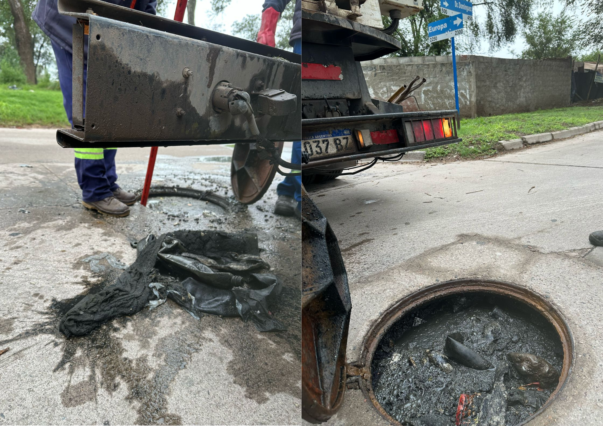 En la boca de la esquina Europa y Dr. Domínguez, los trabajadores de Obras Sanitarias que vienen haciendo un rastreo de zonas taponadas se encontraron con una desagradable sorpresa: un gran efluente de grasa sostenido por mucha basura, entre la cual se encontraba una cámara de un vehículo grande, trozos de goma espuma, y hasta ropa vieja.  También encontraron en la calle Villegas, entre Italia y Bolivia efluentes de grasa que pueden reconocerse fácilmente por las manchas blancas que dejan en el pavimento y el color aceitoso de agua.