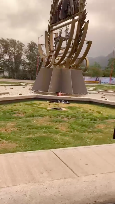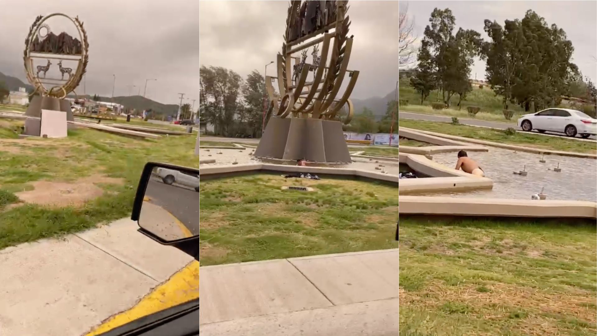 El video muestra claramente a un individuo sin ropa disfrutando de un baño en la fuente, cuya principal característica es el escudo de la Provincia de San Luis.