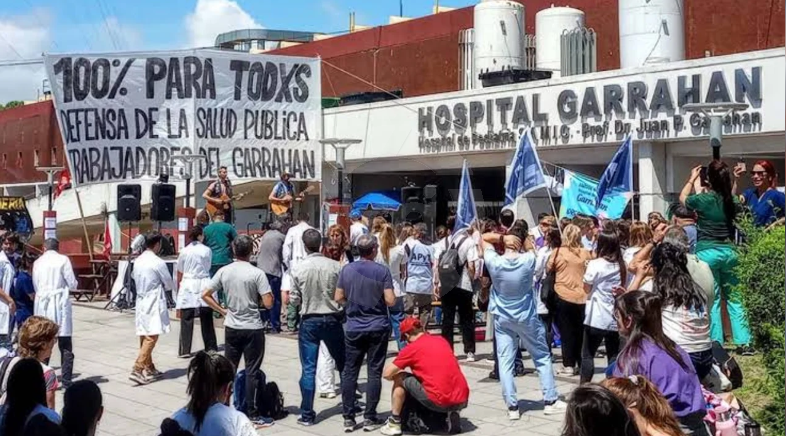 Trabajadores del Hospital Garrahan iniciaron hoy un paro de 48 horas, en rechazo al aumento salarial anunciado por el Gobierno Nacional. La medida fue votada en asamblea con participación de la APyT, la Junta Interna de ATE, Autoconvocados y otros sectores.