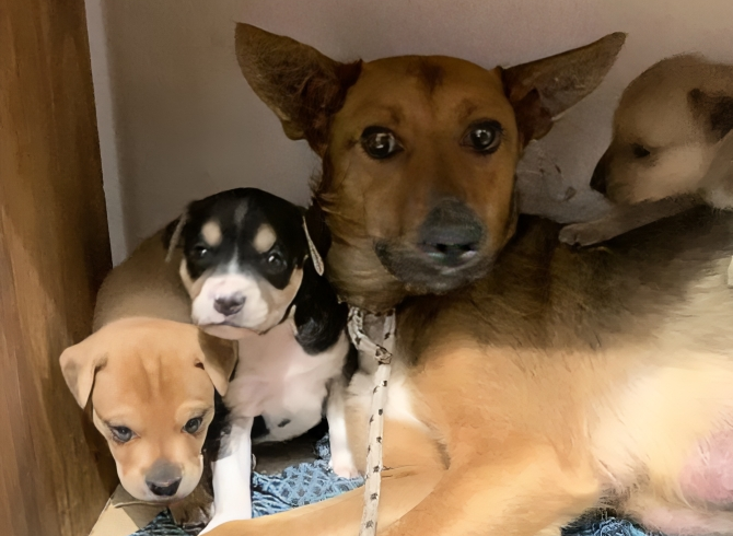 El hogar de tránsito de Frida se ha agotado, y ahora, junto a sus tres cachorros restantes, necesita un nuevo espacio donde puedan estar seguros. Frida sigue siendo desconfiada y asustadiza, pero ha mostrado mejoras significativas en su comportamiento.