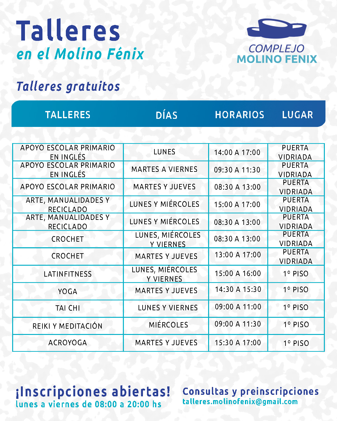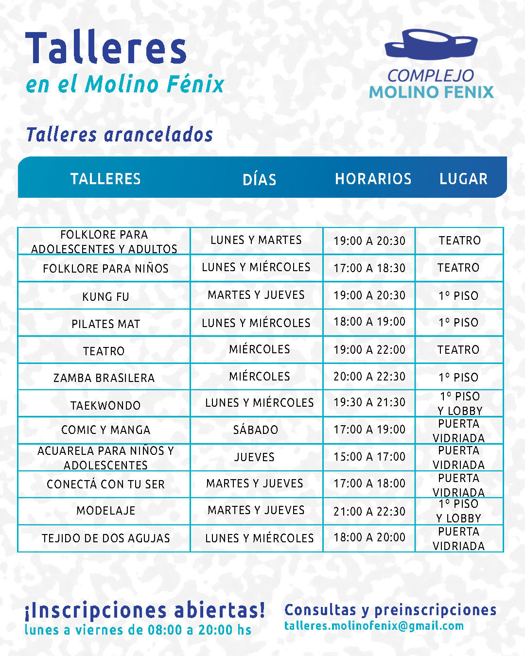 El Complejo Molino Fénix sigue consolidándose como uno de los espacios culturales más importantes de la ciudad, ofreciendo una variada grilla de talleres arancelados y actividades para toda la familia.