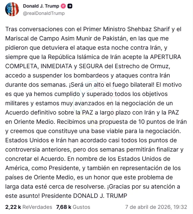 Según detalló el mandatario en un mensaje difundido a través de su red social, la decisión fue tomada tras conversaciones con el primer ministro pakistaní Shehbaz Sharif y el jefe militar Asim Munir. El acuerdo contempla un alto el fuego bilateral condicionado a que Irán garantice la apertura inmediata, segura y completa del estrecho de Ormuz.