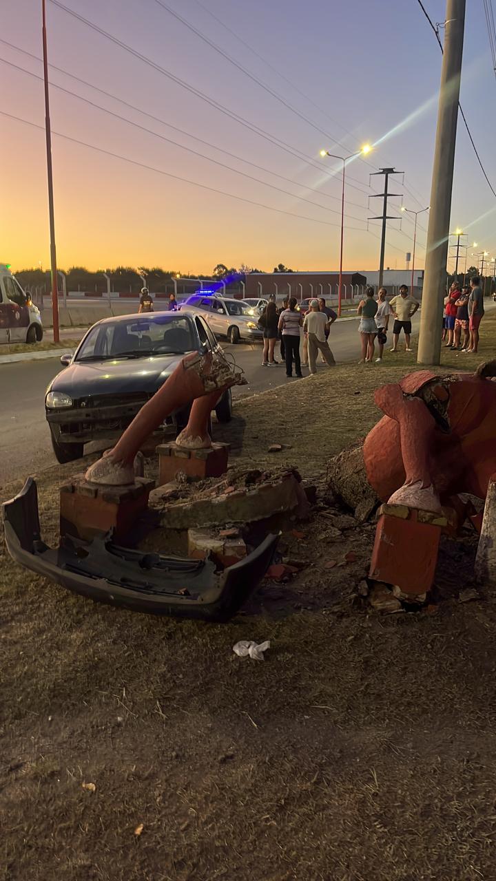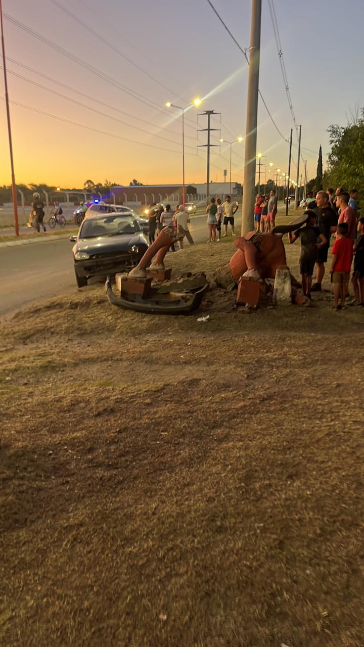 El siniestro ocurrió a las 20:40 de este miércoles, en plena Nochebuena, cuando dos vehículos protagonizaron una maniobra peligrosa. Según testigos y un video compartido en redes sociales, uno de los autos intentó adelantarse al otro, lo que derivó en una colisión. Como resultado, uno de los rodados perdió el control, realizó un trompo y terminó impactando de lleno contra la estatua de cemento.