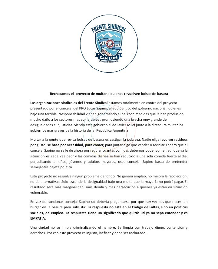 Tras conocerse el proyecto, el Frente Sindical de Villa Mercedes emitió un comunicado en el que manifestó su rechazo a la iniciativa. Las organizaciones sostuvieron que la propuesta “castiga la pobreza” y advirtieron que podría profundizar la situación de vulnerabilidad de personas que recurren a la recolección informal de residuos para subsistir.